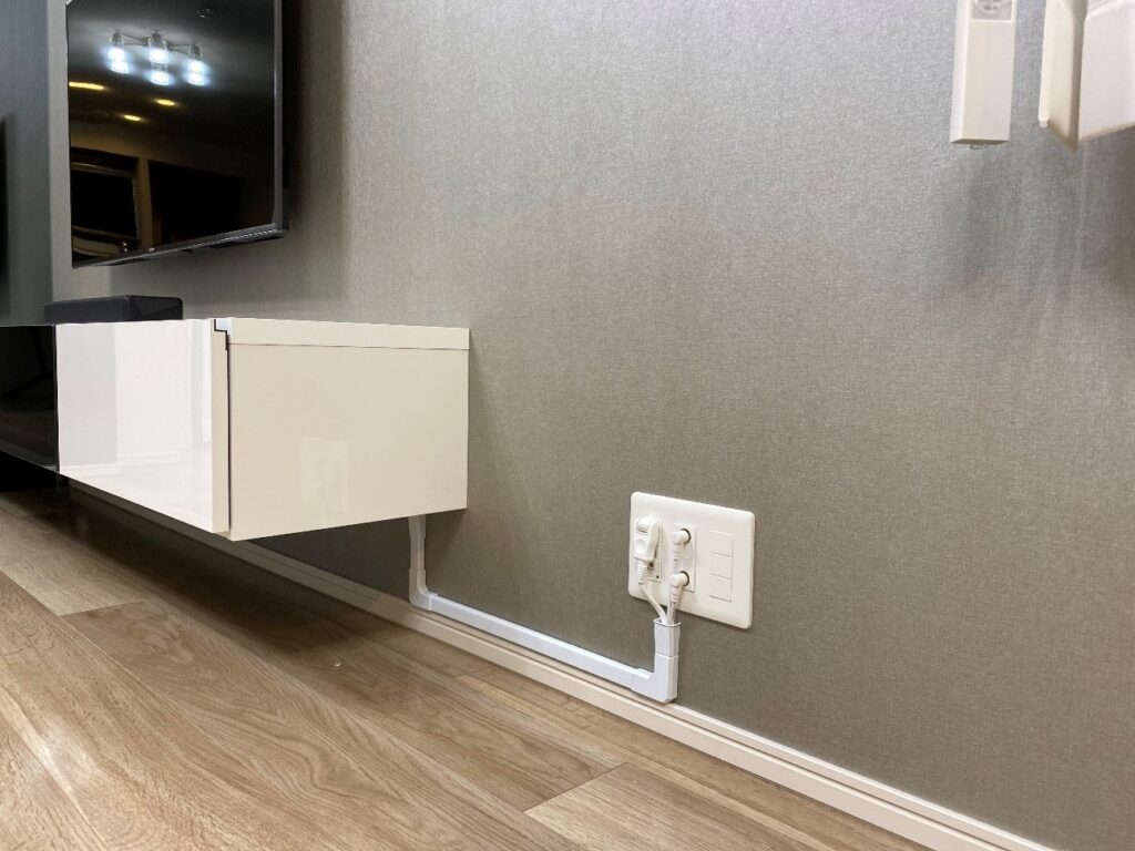 柱へ大型ミラーの設置でしたが、搬入エレベータが大きいサイズでしたので床から天井までの1枚で製作しました。テレビボードの下にルンバ基地を設けるということで、ミラーを施工した柱のコンセントから分岐してテレビボード下へ新たにコンセントを設置しました。テレビ線・電源線は既存マルチメディアコンセントより配線モールにて配線、テレビボードとテレビ間の配線は、壁内部の隠蔽配線としました。午前中にアクセントクロスと柱のミラー、電源増設を行い、午後からテレビボード施工を行い、1日でミラクルチェンジしたリビングルームです。カラーコーディネートもすっきりでリラックス間違いなしです。